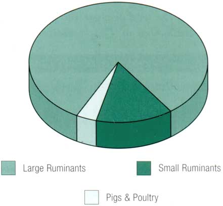 Methane emission by livestock is a direct result of the capacity of ruminants to utilize large amounts of fibrous grasses, which cannot be used as human food. Ruminant livestock, such as cattle, sheep and goats have a large anaerobic digestion vessel "the rumen", which contains a large microbial fauna. which ferment and digest roughages. This digestion results in relatively large methane emissions per unit of feed energy consumed. Pigs and poultry cannot digest these fibrous feeds and have therefore relatively low emissions. Thus, ruminant animals, when fed low quality feed, have higher methane emissions per unit of product than better fed animals, although the latter - as has been shown before - often leave other heavy environmental loads in soil and water pollution.