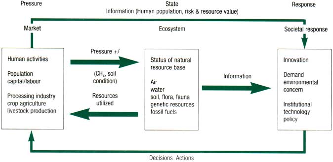 The DSR model (OECD, 1996) basically helps to identify and understand the processes involved in livestock environment interactions. It focuses first on the human activities that create pressures (the earlier name was Pressure-State-Response Model), which are animal and crop agriculture, and related processing. These activities create positive or negative forces (for example methane emission, soil compaction, or improvement of soil structure through nutrient recycling), which change the quality and quantity of the natural resource base of air, water, soil, flora and fauna, and non-renewable resources. Information on the state of that resource base, reinforced or weakened by the valuation of the society of environmental values, leads to a societal response. Society responds to this information through environmental, general economic and sectoral policies. Changes in these policies will generally change the incentives to use certain technologies, for example, pollution mitigation, reduction of methane emission or positive synergies between livestock and wild-life. The model is especially suitable to guide the identification of the critical parameters to be used in an environmental impact assessment of proposed livestock projects and policies.