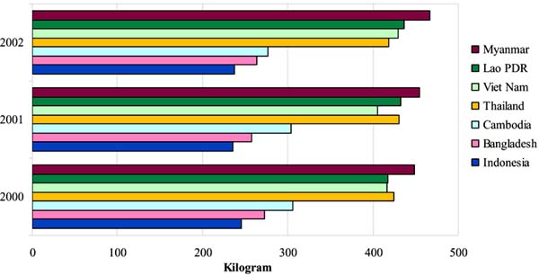 Countries in Asia-Pacific region with largest per capita rice paddy production in 2002