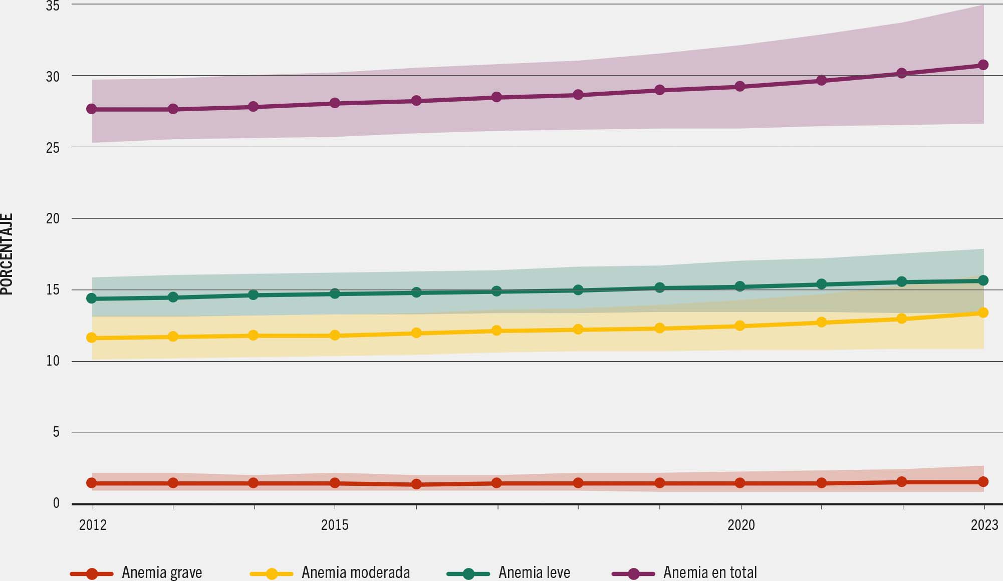 De las nuevas estimaciones que se presentan en este informe se desprende un mensaje diáfano: de 2012 a 2023 no se ha avanzado a escala mundial en la reducción de la prevalencia de la anemia en las mujeres de entre 15 y 49 años. De los datos cabe inferir también un aumento reciente de la prevalencia. Ello debería servir de contundente llamamiento a la acción.