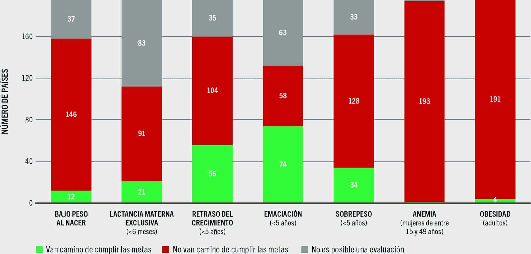 Entre los 132 países sobre los que se dispone de datos para determinar los avances en materia de emaciación infantil, más de la mitad (74 de 132) van camino de cumplir la meta prevista para 2030. Hay más países que van camino de alcanzar la meta relativa a la emaciación infantil que respecto de otros indicadores del estado nutricional infantil. Entre los indicadores del estado nutricional infantil, el bajo peso al nacer es el que presenta el menor porcentaje de países que van camino de cumplir la meta: 8 % (12 de 158). En el caso del retraso del crecimiento infantil, el 35 % de los países (56 de 160) va camino de cumplir la meta; el porcentaje es menor en el caso del sobrepeso infantil: solo el 21 % de los países de los que se dispone de datos sobre los avances al respecto (34 de 162) va por el buen camino. Si bien es considerable el número de países que van camino de cumplir estas metas, muchos necesitan acelerar sus avances para alcanzar las metas previstas para 2030 relacionadas con los indicadores centrados en los niños.