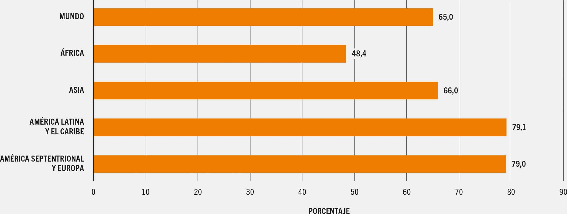 Se observan marcadas diferencias entre regiones, y el porcentaje más bajo de mujeres que alcanzaban la diversidad alimentaria mínima corresponde a África (48 %), mientras que el más alto corresponde a América septentrional y Europa (79 %). Oceanía se ha excluido del análisis porque solo se disponía de datos de un país. África también presenta el porcentaje más bajo de niños de 6 a 23 meses que alcanzaban la diversidad alimentaria mínima (25 %), seguida de Oceanía (34 %), Asia (38 %) y América Latina y el Caribe (62 %). Solo hay datos sobre la diversidad alimentaria mínima de niños de 6 a 23 meses para cinco países de América septentrional y Europa, y las estimaciones correspondientes a Oceanía no incluyen información sobre Australia y Nueva Zelandia debido a la falta de datos. La falta de datos deja grandes lagunas e impide entender del todo las dietas de distintas partes del mundo.
