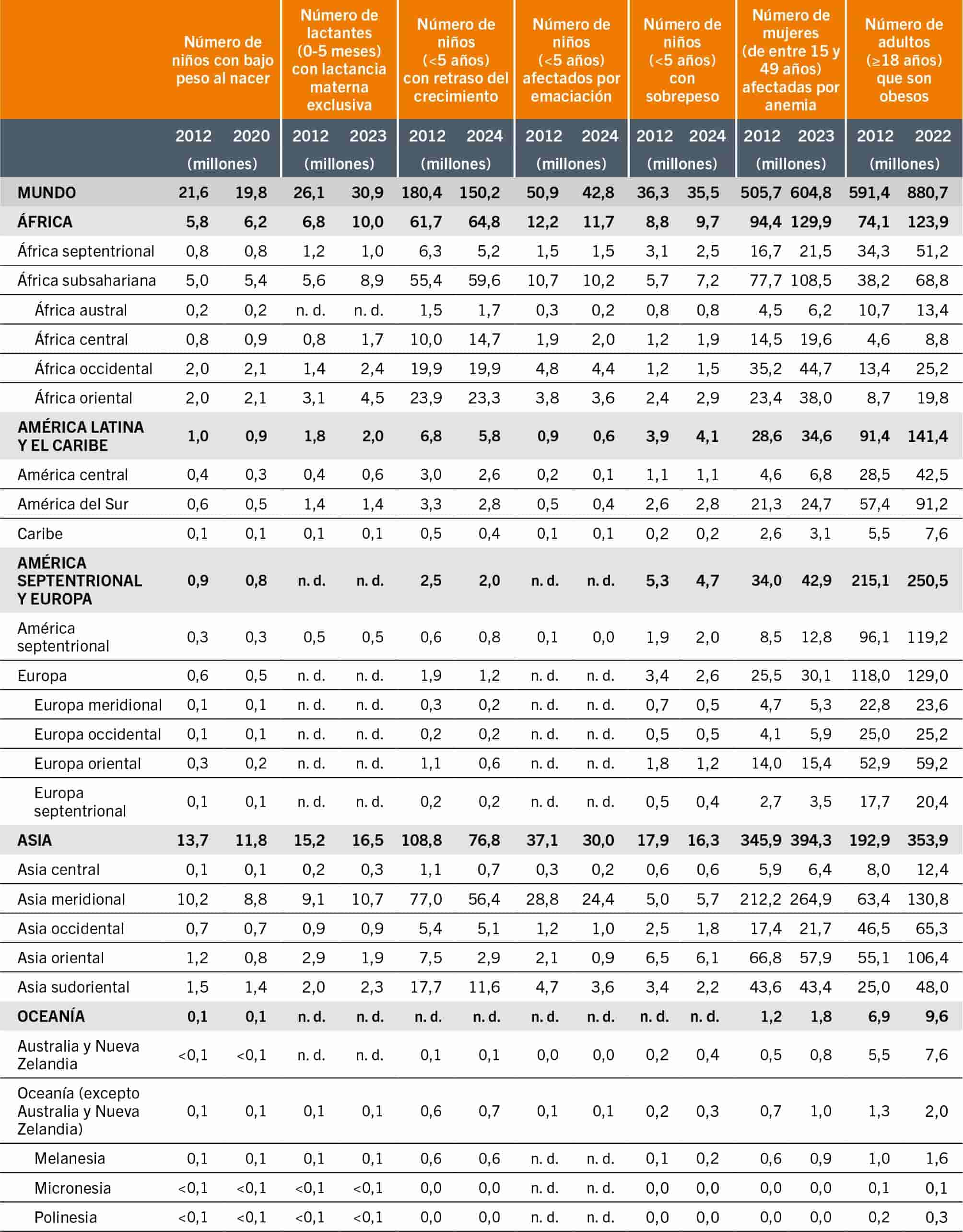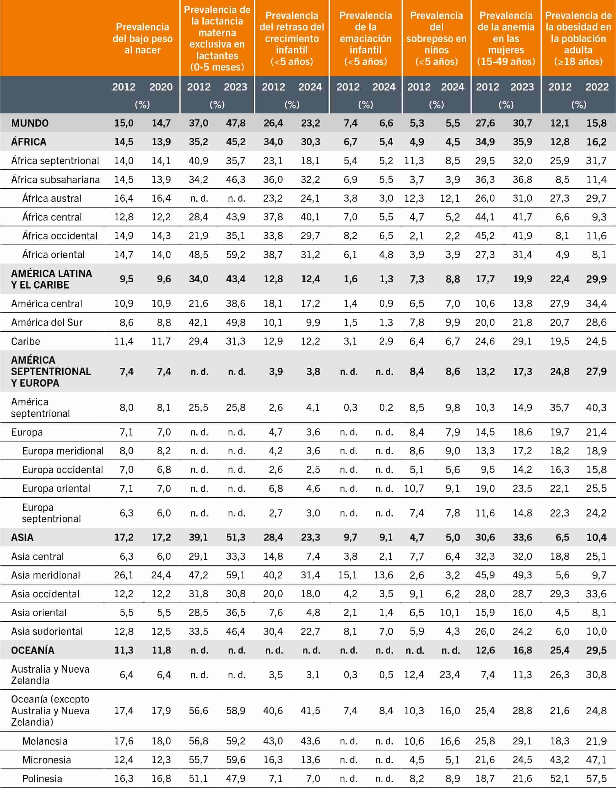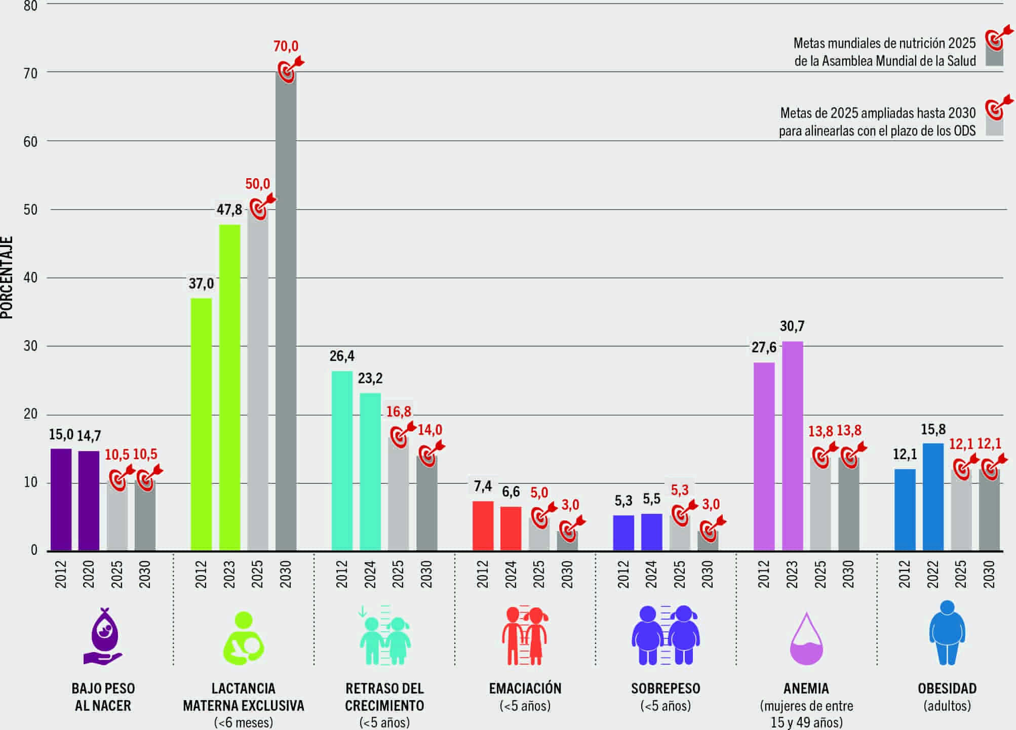 FUENTES: Los datos relativos al retraso del crecimiento, la emaciación y el sobrepeso se basan en Banco Mundial, OMS y UNICEF. Levels and trends in child malnutrition: UNICEF/WHO/World Bank Group Joint Child Malnutrition Estimates. Key findings of the 2025 edition. Nueva York (EE. UU.), Ginebra (Suiza) y Washington, D.C. [Consultado el 4 de abril de 2025]. https://data.unicef.org/resources/JME, https://www.who.int/teams/nutrition-and-food-safety/monitoring-nutritional-status-and-food-safety-and-events/joint-child-malnutrition-estimates/latest-estimates, https://datatopics.worldbank.org/child-malnutrition/; los datos relativos a la lactancia materna exclusiva se basan en UNICEF. 2024. Infant and young child feeding. En: UNICEF. [Consultado el 30 de abril de 2025]. https://data.unicef.org/topic/nutrition/infant-and-young-child-feeding; los datos correspondientes al bajo peso al nacer proceden de OMS y UNICEF. 2023. Low birthweight joint estimates 2023 edition. [Consultado el 28 de abril de 2025]. https://data.unicef.org/topic/nutrition/low-birthweight; www.who.int/teams/nutrition-and-food-safety/monitoring-nutritional-status-and-food-safety-and-events/joint-low-birthweight-estimates; los datos relativos a la anemia se basan en OMS. 2025. WHO Global Anaemia estimates, 2025 edition. [Consultado el 8 de mayo de 2025]. https://www.who.int/data/gho/data/themes/topics/anaemia_in_women_and_children; los datos relativos a la obesidad en adultos se basan en OMS. 2024. Global Health Observatory: Prevalence of obesity among adults, BMI >= 30 (age-standardized estimate) (%). Estimates by country. [Consultado el 24 de julio de 2024]. https://www.who.int/data/gho/data/indicators/indicator-details/GHO/prevalence-of-obesity-among-adults-bmi-=-30-(age-standardized-estimate)-(-). Licencia: CC BY 4.0. Las metas proceden de: OMS y UNICEF. 2017. Methodology for monitoring progress towards the global nutrition targets for 2025 – technical report. Nueva York (EE. UU.) y Ginebra (Suiza). https://data.unicef.org/resources/methodology-for-monitoring-progress-towards-the-global-nutrition-targets-for-2025; y OMS y UNICEF. 2018. The Extension of the 2025 Maternal, Infant and Young Child Nutrition Targets to 2030 – WHO/UNICEF discussion paper. Nueva York (EE. UU.) y Ginebra (Suiza). https://data.unicef.org/resources/extension-of-2025-maternal-infant-young-child-nutrition-targets-2030