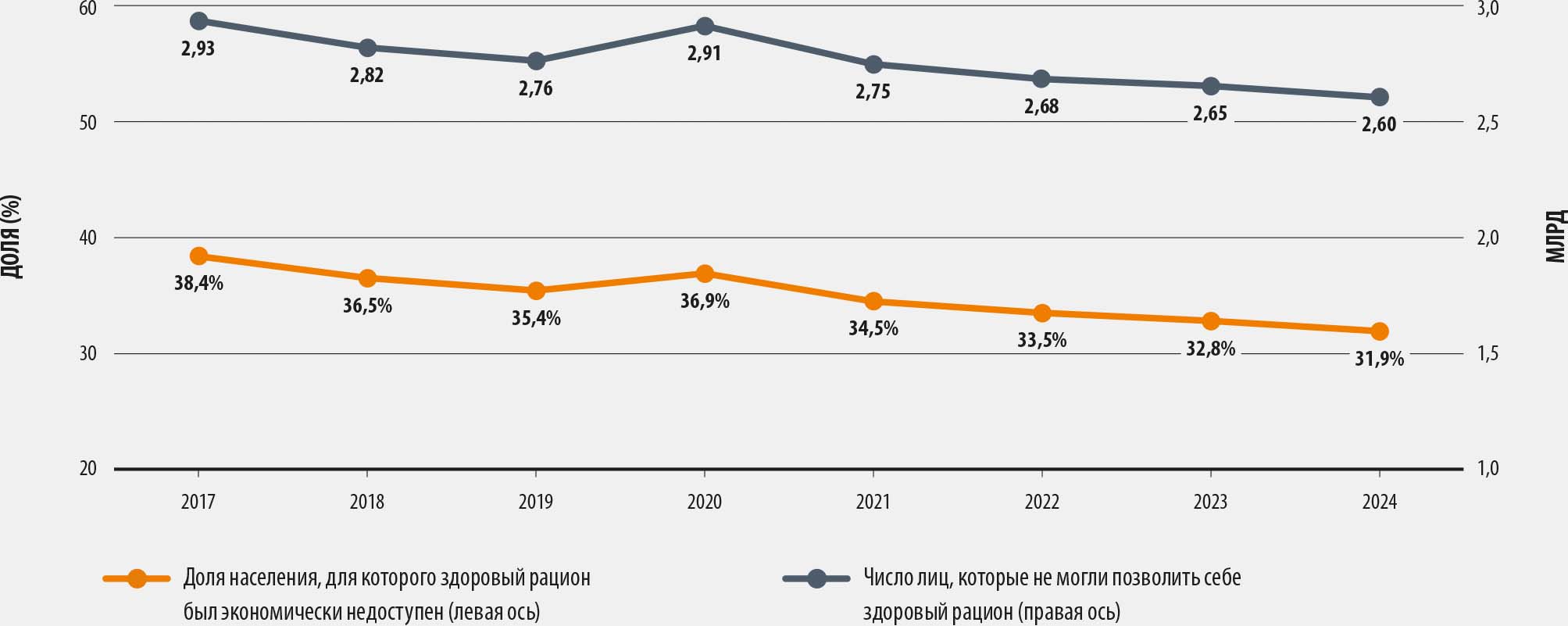 Рисунок 2.7 В период с 2020 по 2024 год число жителей планеты, которые не могут позволить себе здоровый рацион, сократилось как в относительных, так и в абсолютных показателях