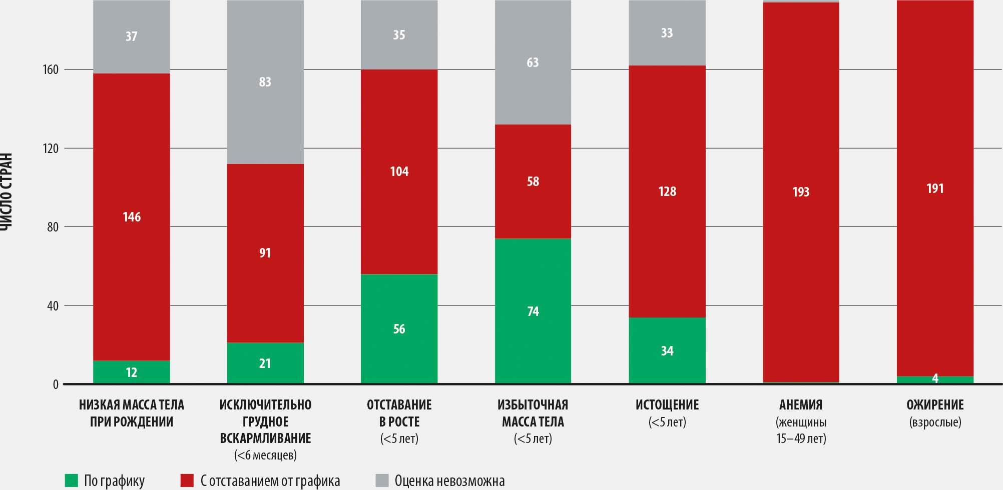 Более половины из 132 стран, располагающих данными для оценки прогресса в сокращении масштабов истощения у детей (74 из 132), ведут работу по достижению цели на 2030 год по намеченному графику. Деятельность по сокращению истощения у детей ведется по графику в большем числе стран, чем по другим показателям состояния питания детей. Что же касается сокращения распространенности низкой массы тела при рождении, то работу по этому показателю в намеченные сроки выполняет самая низкая доля стран – 8 процентов (12 из 158). Работу по сокращению масштабов отставания в росте у детей в соответствии с намеченным графиком ведут 35 процентов стран (56 из 160), а работу по сокращению распространенности избыточной массы тела у детей – всего 21 процент стран, публикующих данные о прогрессе (34 из 162). Многие страны ведут работу по достижению глобальных целей на 2030 год, касающихся питания детей, без отставания от графика, но многим другим странам необходимо ускорить работу.
