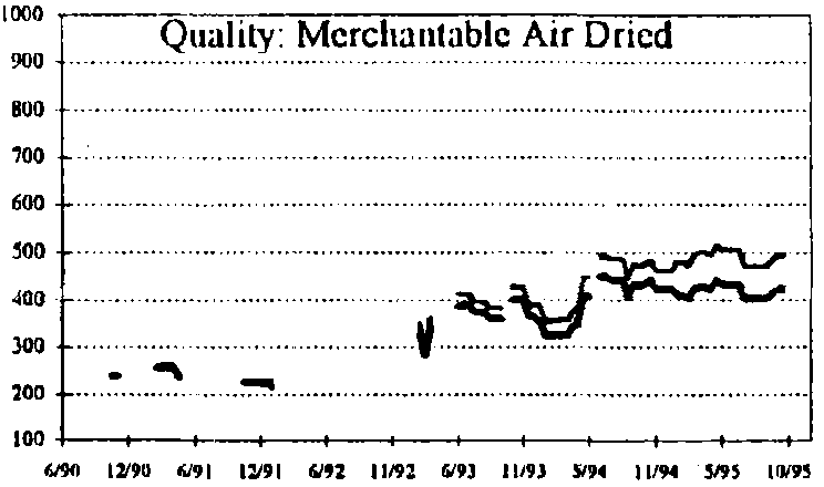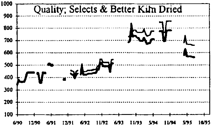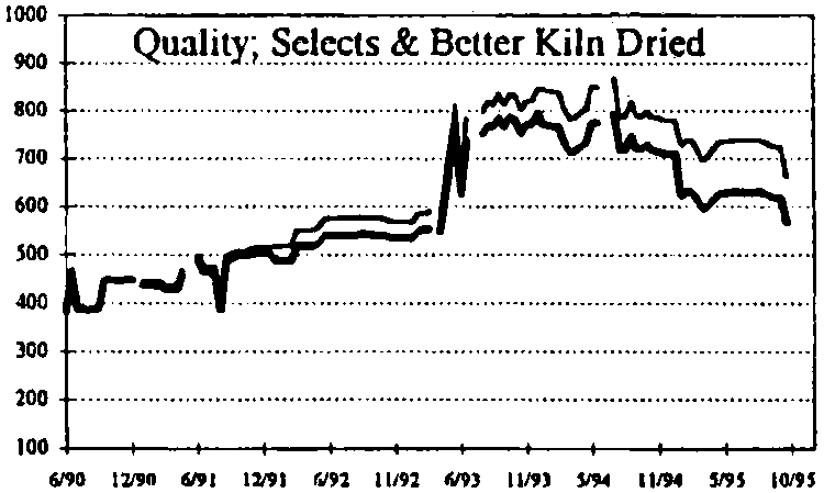 Price for Light Red Meranti, Selects and Better, Kiln Dried are much more discontinuous as reported, yet closely follow the trend for Dark Red Meranti. Price spiked to US$ 800/cum in late 1993 (a few months later than the price spike for Dark Red Meranti), but rapidly declined to nearer US$ 700/cum before again climbing to near US$ 800/cum briefly in late 1994. Price at mid 1995 appears to be near US$ 600/cum and declining.