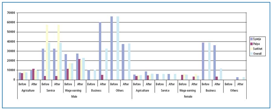 | Structure of income before and after introduction of MUS (NRs). | Source: Field survey 2005 ( USD = 70 NR) |