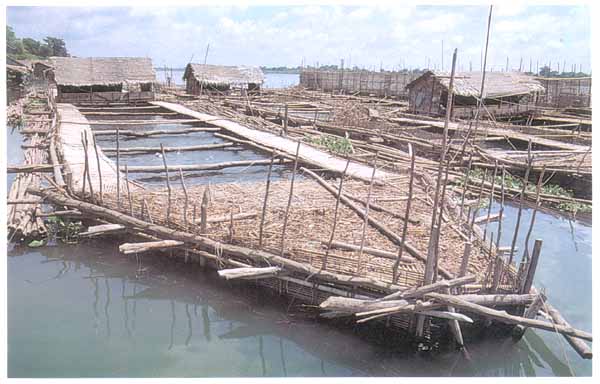 Cage culture systems are commonly operated in rivers and streams and these systems have also been reported as originating in Cambodia (Chua and Tech, 1990). Both pen/cage and cage culture systems are very popular among the ethnic Chinese and Vietnamese and at present there are around 5,000 fish farmers engaged in these sub-sectors. The value from production of these systems in 1993 was US $ 7,200,000. Pen/cage and cage culture systems are known as intensive fish culture with high stocking densities and feeding rates. The feeding strategy adopted is based on the availability of feed ingredients rather than on any scientific consideration.
