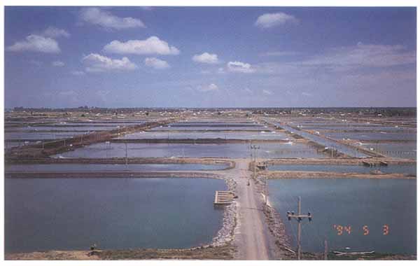 Shrimp farms have operated along the coast of the Gulf of Thailand for more than 50 years, originating in the Inner Gulf at Samut Prakarn Province. Originally, paddy fields were converted to shrimp ponds by flooding them with seawater during the monsoon season. The incoming sea water, laden with shrimp seed, was confined in the field for 3–4 months (until the shrimp reached market size), after which the water was drained out through sluice gates and the shrimp collected with a bag net. The main species produced were Penaeus merguensis (banana or white shrimp). About 10 years ago, Thailand succeeded in culturing hatchery seed on a commercial scale and many hundreds of millions of shrimp seeds were produced. This accelerated the development of shrimp farming into semi-intensive culture and finally, intensive culture systems. The coastal area devoted to shrimp farming expanded from 4 provinces in the Inner Gulf (Bangkok, Samut Prakarn, Samut Sakorn and Samut Songkran) to the whole coastal area of 23 provinces. As the seed which is mass produced is Penaeus monodon (black tiger shrimp), this subsequently became the main cultured species.