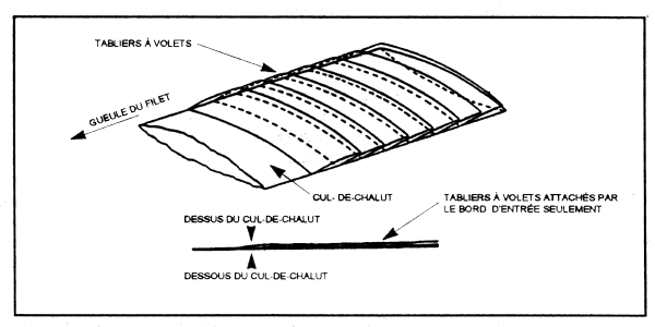 L'utilisation de tabliers de protection et de filins de renfort est une deuxième mesure de gestion. Les tabliers sont des dispositifs que l'on fixe sur la partie supérieure et inférieure des engins de pêche traînés pour protéger les filets coûteux de l'usure due au frottement sur les fonds marins et les conserver plus longtemps. Ces dispositifs peuvent se présenter sous la forme de filets (tabliers de dessus), ou de bandes de cuir, (tabliers de dessous). Ces accessoires fixés à l'engin sont couramment utilisés et nécessaires, mais ils ont pour inconvénient de resserrer les mailles et, partant, de retenir tous les poissons qui ont été capturés dans le filet. Or on a constaté que la manière de les fixer n'a aucun impact sur ce phénomène. On utilise ordinairement des tabliers de dessous faits de grosses ficelles entortillées ou de morceaux de cuir, notamment pour les chaluts de fond, où le filet râcle le fond marin. Ils doivent obligatoirement être fixés à l'extrémité du filet (cul-de-chalut). Les tabliers de dessus peuvent avoir des formes et des tailles différentes, la seule obligation étant normalement qu'ils soient fixés seulement au cul-de-chalut, sans recouvrir les mailles, de façon à ne pas rétrécir leurs ouvertures normales dans le cul-de-chalut. Les figures ci-après montrent deux types de tabliers.