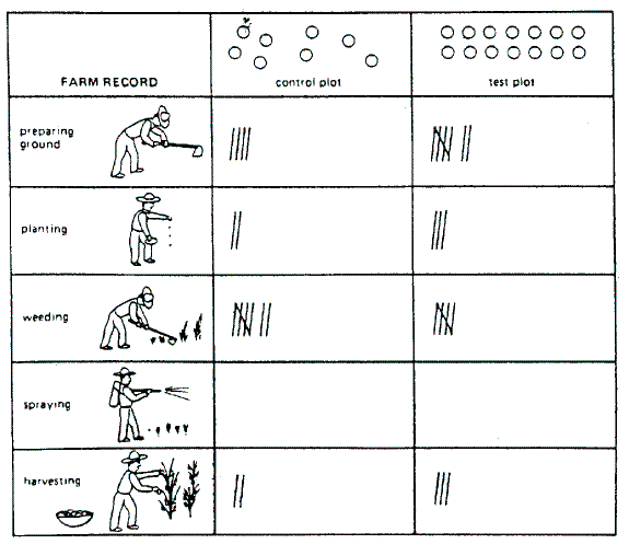 An adaptation of the "Sample Farm Record" might be suitable for use with farmers. Even farmers who do not know how to read and write can keep records of the time they spend working in various activities. By making one mark for every half-day spent doing specific jobs, a farmer can compare time worked on the control plot with the time spent on the test plot.