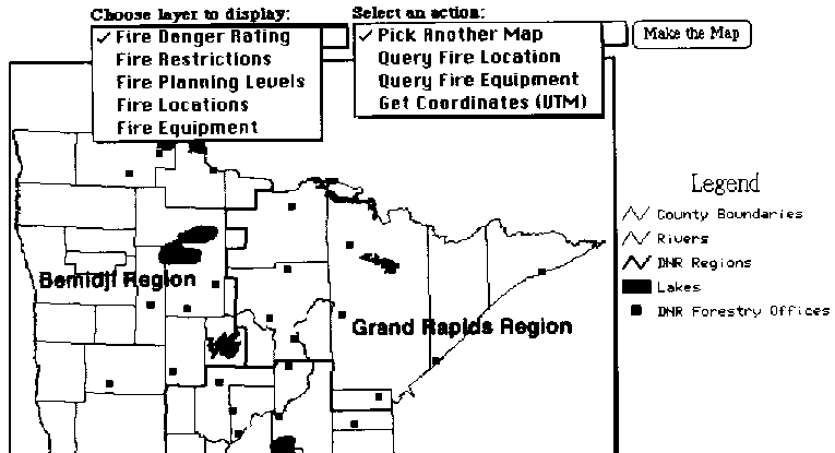 The fire mapping application is a WWW browser-based interface to a geographic information system (GIS) on fires and fire-related intelligence for the State of Minnesota. A user's entry into the system begins with a map of the state (Figure 1). In addition to major water bodies and county boundaries, this base map delineates the working regions of the Minnesota Department of Natural Resources' Division of Forestry (DNR-Forestry), the land management agency with the primary responsibility for forest fire prevention and suppression in Minnesota. The "display" and "action" pull-down menus associated with the map (Figure 2) allow a user to query the GIS for additional map information or specific attributes associated with map elements. For example, choosing the action "Pick Another Map" generates a map of the currently selected display, while choosing "Get Coordinates" retrieves the location of any point clicked on the current map.