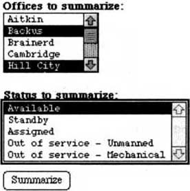 Tracking the location and availability of fire-fighting resources within a land management organization is critical. During the peak of a fire season, such information may change almost continually. Outdated information is of little or negative value in fire-fighting planning. A prototype application addressing the organization and delivery of fire-fighting resource information was developed for one DNR-Forestry Region within the State of Minnesota for use during the spring 1996 fire season. The user of the application is presented with a very simple two-menu interface which provides access to a central server-residing database (Figure 3A). Selecting an office or set of offices in combination with a status type produces a report detailing equipment type, owner and current location for all pieces of equipment that meet the selection criteria (Figure 3B). A map with major roads delineated can also be generated to facilitate the planning of equipment acquisitions.