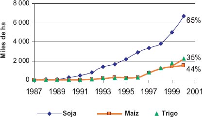 Fuente: Asociación Argentina de Productores de Siembra Directa (AAPRESID), 2003. (Los porcentajes indican la proporción sobre el total nacional).