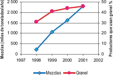 El desarrollo del uso de fertilizantes a granel es un fenómeno reciente en la agricultura Pampeana, ofreciendo ventajas económicas derivada de la eliminación del uso de bolsas y de un aumento en la eficiencia del tiempo operativo(Figura 5). El uso de fertilizantes líquidos ha progresado en el mismo periodo, por las mismas razones.