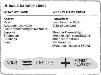 The Management Team also needs to know how much the SFGA owes to members or to others. That is important because if the SFGA doesn't pay its debts on time, it will earn a bad reputation and may run into problems with the law. These obligations are called Liabilities and include such things as a bank loan to the SFGA that must be repaid, and unpaid bills that the SFGA owes to suppliers or to members for goods or services received.