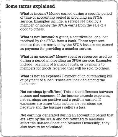 By knowing exactly what resources are being used, and where they come from, the SFGA can find better ways to manage its services. By knowing what has been spent and earned, SFGA leaders and members are able to ensure that the income generated by the SFGA is enough to cover its costs. In short, financial records make it easy to see whether the business is doing well or badly.