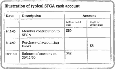 One of the weaknesses of a general journal or receipt/payment voucher book is that information on transactions is recorded one after the other. It may be difficult, therefore, to classify and summarize. This problem is solved by creating item accounts (for all main Balance Sheet or Income Expense items of importance to the SFGA). The most important item account that the SFGA needs to monitor is the cash account. This is absolutely essential in keeping track of how much money comes into the SFGA and where it comes from, how much goes out and where it goes to, and what is left. This task is the main responsibility of the SFGA Treasurer. Some SFGAs keep a separate cash book to store this important information.