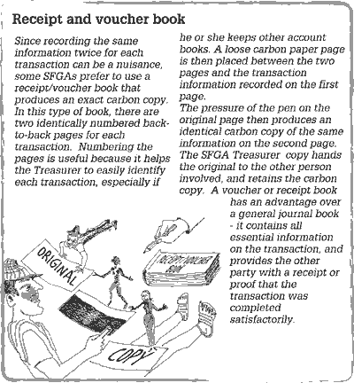 Accounting books are the "financial memory" of an SFGA. They help the Management Team, SFGA Board and members keep track of what the SFGA has, who paid how much to whom, and who owes what to whom. An SFGA without some kind of financial record system is asking for trouble. It's like being in a unknown place without a map. You don't know where you are, where you came from or where you are going!