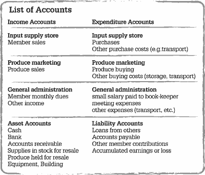 To determine which type of accounts to include, it may be useful to first draw up a "chart of accounts", i.e. a plan of how to record, in a systematic way, financial information on the SFGA's member service activities. The number and categories of accounts will depend on the business requirements of each SFGA and will vary. The table below shows a chart of accounts for an SFGA that provides bulk input purchase and marketing services to its members: