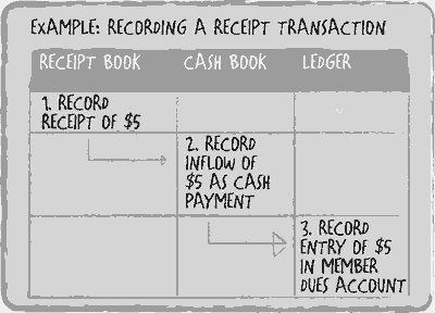 Step 2. The Treasurer then records the same information in the cash book as a receipt, noting the date of the transaction, the purpose and receipt book number.