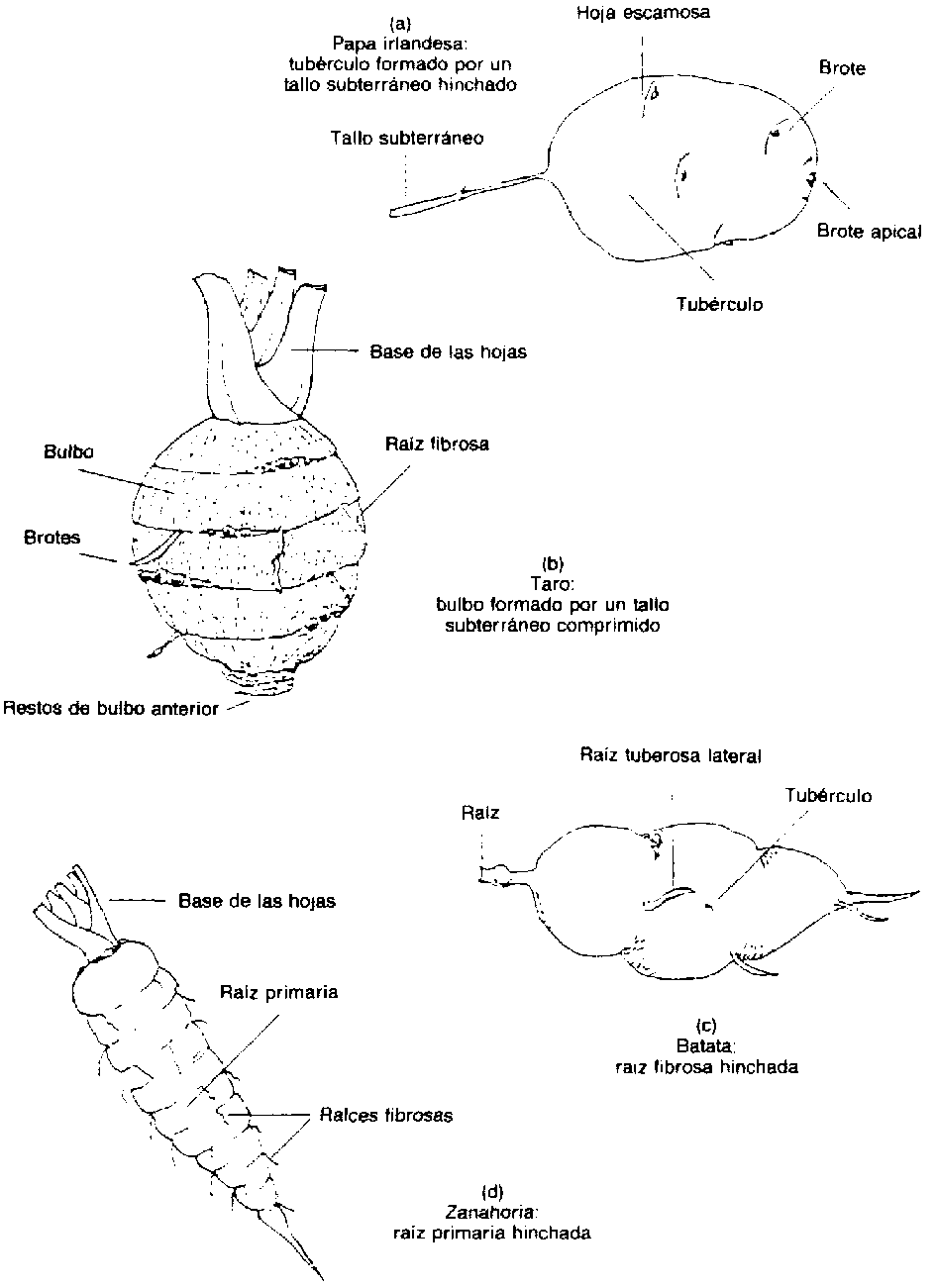 En la mayoría de esos productos las sustancias nutritivas almacenadas son almidones, pero en algunos tubérculos de raíz primaria, como la zanahoria, son fundamentalmente azúcares.
