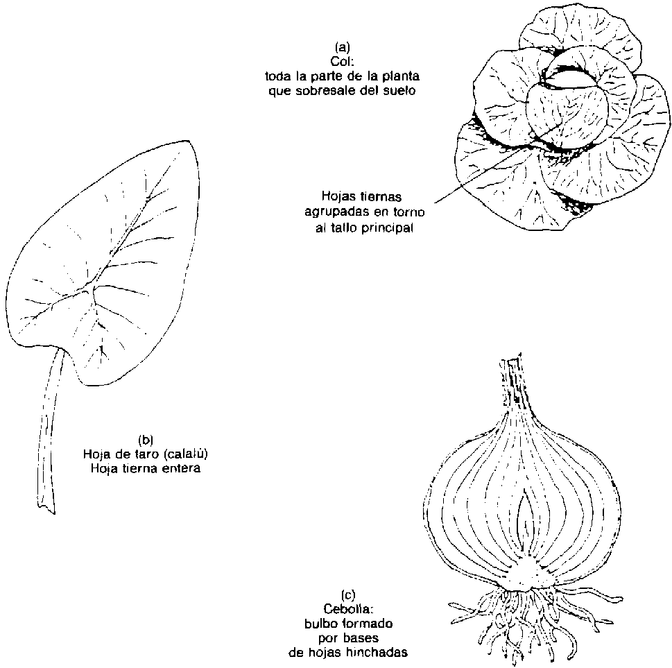| Hojas solamente | Taro (calalú), espinacas (Figura 5b) |