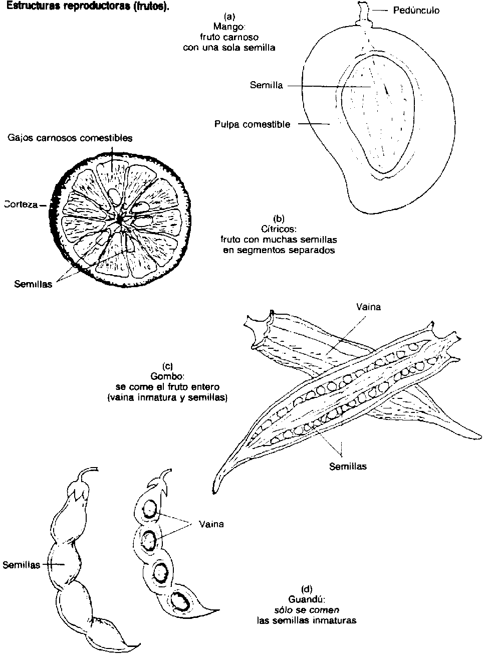 | Vainas verdes inmaturas con semilla parcialmente desarrollada | Frijoles verdes, dólicos (poroto espárrago, bodi), gombo (Figura 6c) |