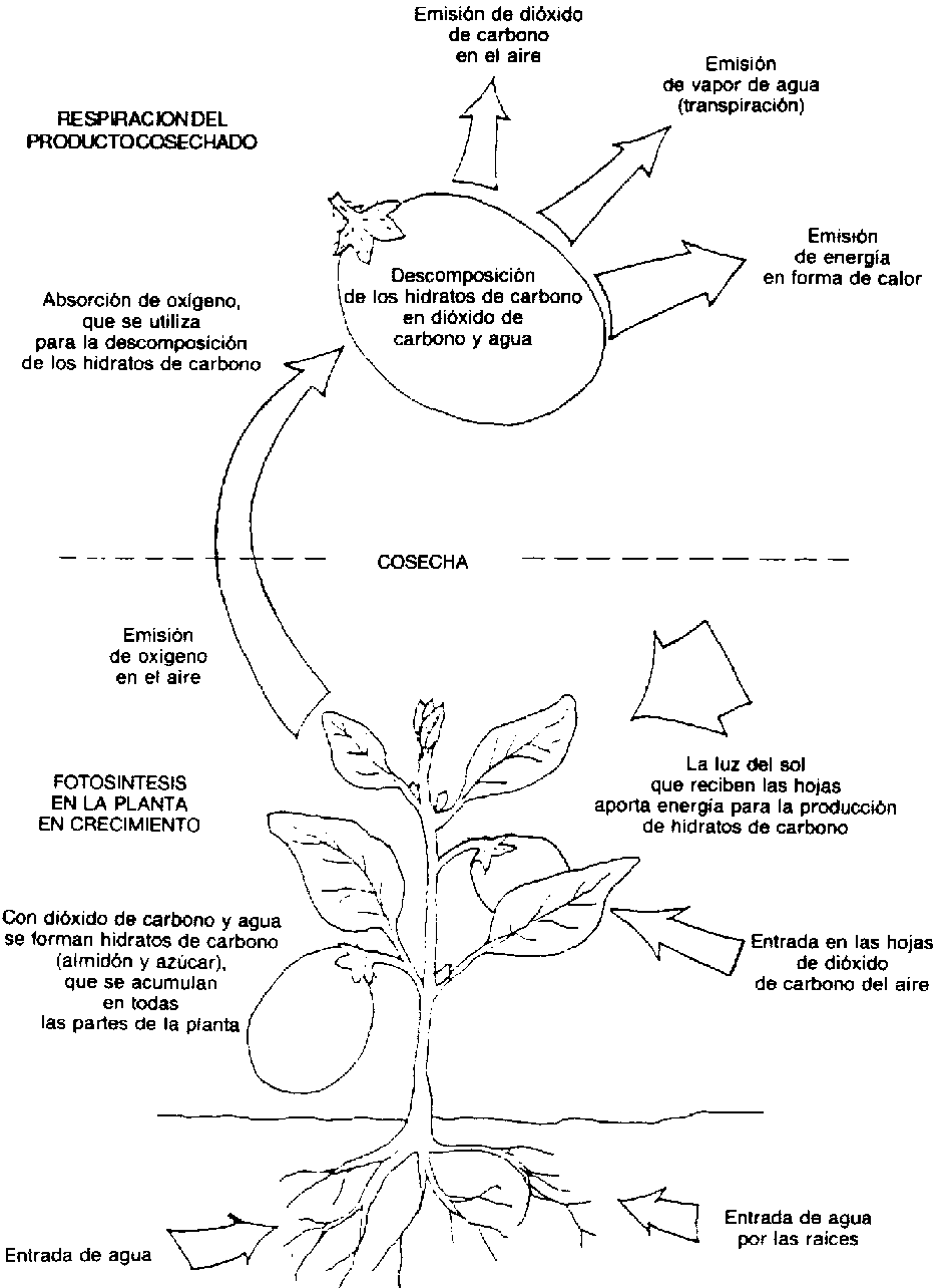 La respiración es una reacción básica de toda la materia vegetal, tanto en los campos como después de la cosecha. En la planta en crecimiento, el proceso se prolonga sin interrupción mientras las hojas sigan fabricando hidratos de carbono, y no puede detenerse sin dañar a la planta o al producto cosechado.