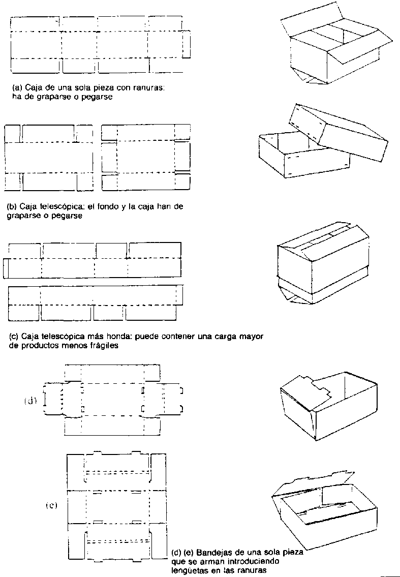 Con cartón macizo o acanalado se fabrican cajas de tapa plegadiza o telescópica (separada), así como bandejas, menos profundas y abiertas por arriba. Las cajas se suelen vender abatidas (planas), y las monta el usuario. El montaje y el cierre de las cajas se realizan con cinta adhesiva, cola, grapas o lengüetas y ranuras (Figura 13).