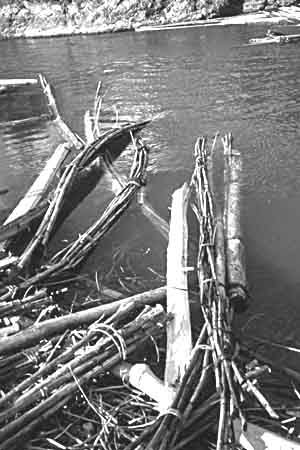 En la región meridional del Parque Nacional de Lore Lindu, el rotén se transporta atándolo a troncos flotantes que lo llevan a lo largo del río Lariang