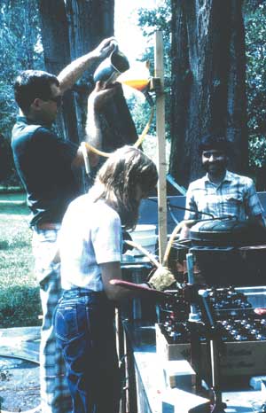 The 90ºC juice is hot filled into cleaned glass bottles almost to the top of the bottle. The cap is crimped on the bottle with a bottle-capping machine (Figure 11.17) and the bottles laid on their sides for at least 3 minutes to allow the hot juice to sterilize the cap. Then the bottles are cooled in running water to preserve the flavour. Whenever the juice supply is running low the coil can be filled with clean water and pulled out of the boiling water bath until there is sufficient juice ahead to resume pasteurizing. Be sure to flush the water from the coil and insure the exiting juice temperature is at least 90ºC before resuming filling the glass bottles. Immediately after finishing running all of the juice for the day, remove the coil from the boiling water; flush the coil with large amounts of water to remove any traces of juice. Then flush the coil with 1 percent NaOH, a strong base, to remove any scale that may have formed inside the coil. Then this base needs to be washed from inside the coil with a large amount of water. The remaining water is poured from the coil and the coil allowed to dry. This extraction, pasteurization and bottling system can now be transported to the next village. Additional details are contained in Annex B.