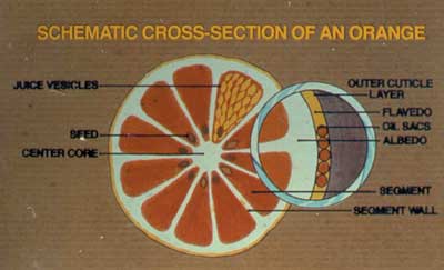 Oil glands are located in the flavedo, the coloured portion of an orange peel (Figure 11.6). When an FMC extractor puts pressure on the peel, the oil in the oil glands is forced out and is mixed with water to form an emulsion. This emulsion goes to a special finisher then to a self-cleaning, de-sludging centrifuge and the final separation is made in a high-speed centrifuge called a polishing centrifuge. Polished oil is stored in the cold to precipitate waxes. Cold-pressed oil gets its name from the original process where peel was mixed with water then pressed in a screw-press with only a small increase in temperature. Even though oil still retains the cold pressed name; the cold press process is no longer used. Table 11.2 gives a yield of cold pressed oil from various citrus cultivars (Kesterson, et al., 1978). Citrus oils are used as flavour and fragrance enhances in beverages, foods and household cleaning supplies.