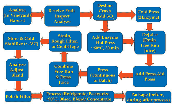 Figure 12.1 illustrates a generalized flowchart for grape juice production. There are several options for juice extraction and subsequent treatment. Methods for commercial preparation of grape juice have undergone continuous change. In most commercial operations, the continuous pressing method is used. Hot pressing is appropriate for deeply pigmented grapes where maximum colour extraction is desired. Whereas, the immediate or cold press procedure is necessary to maintain the initial colour of light coloured grapes.