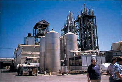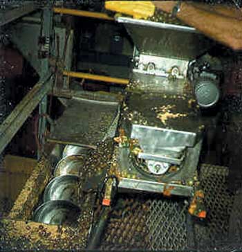 Next, a dejuicer removes 30 to 35 percent of the free-run juice through a 40-mesh screen. The remaining pulp empties into a continuous screw press. The free-run juice may have as much as 20 to 40 percent suspended solids and is combined with the pressed juice that may have only 5 to 6 percent. The combined juices have most of the soluble solids removed by rotary vacuum filtration, pressure leaf filtration or centrifugation (Figures 6.14, 6.15 and 6.16). This process yields approximately 820 L of juice per MT of grapes. An additional 40 L of juice (after the juice and water have been concentrated) may be obtained by breaking up the press cake, spraying it with hot water and re-pressing. (This operation involving the addition of water to extract additional soluble solids is not permitted in table wine manufacture).