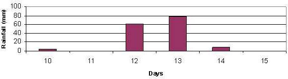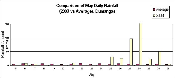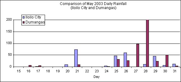 Comparison of the average and daily rainfall values from 25-30 May 2003 with the long-term average rainfall values for Dumangas indicate that the six-day rainfall episode is anomalous and is responsible for the unseasonal flashflood that occurred in some areas in Iloilo and especially, Dumangas on 28 May 2003 (Figure 14). Comparison of rainfall in Dumangas and Iloilo City during this period further points to the localized rainfall anomaly as shown in Figure 15. Twenty-five barangays in the municipality were submerged in floodwaters, which affected 377 families (2,244 people) and damaged crops and infrastructure.