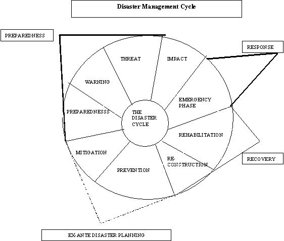 An assessment of local institutional response to recent disasters has been undertaken with reference to each major phase of the disaster management cycle. While detailed analysis is given in the succeeding paragraphs, the highlights of assessments are shown in the figure. It may be observed that the thick line reflects the strong capacity exhibited by the local government organizations in undertaking pre-disaster preparedness and response measures. However, due to various constraints, the management of recovery phase of the disaster reveals some gaps. The recognition of integrating prevention and mitigation into development planning is at the nascent stage.