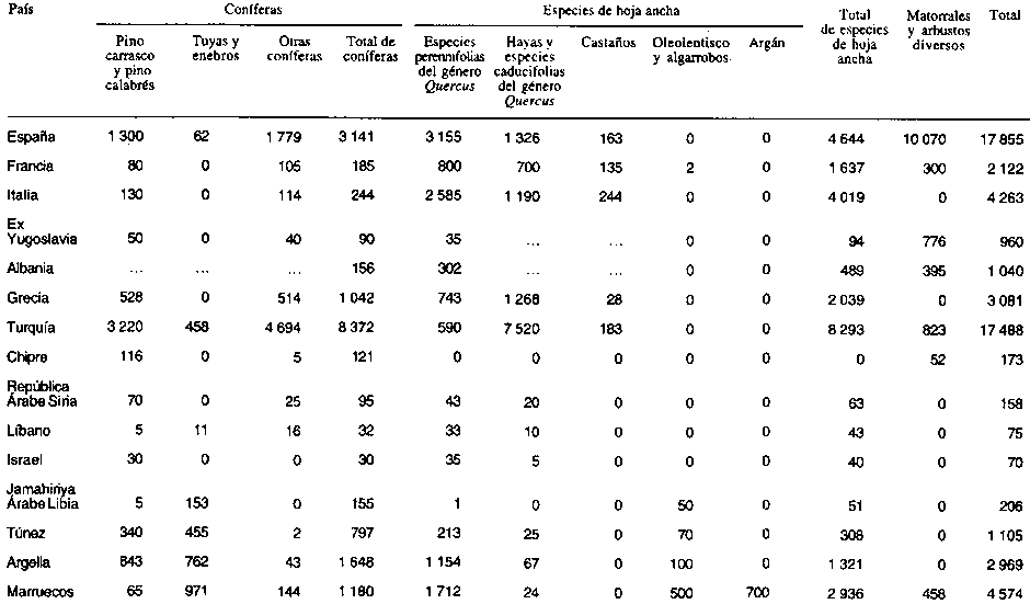 En el Cuadro 2 se presentan de forma sintética los tipos de bosque existentes en el entorno mediterráneo, según los estudios de ecología de determinados autores (Abi Saleh 1978; Akman et al., 1979; Assodollahi et al., 1982; Barbero y Quézel, 1976; Benabid, 1985; Di Castri y Mooney, 1973; Emberger, 1930; Genile, 1982; M'Hirit, 1982, 1993; Quézel, 1981; Quézel y Barbero, 1982; Rivas Martínez, 1982).