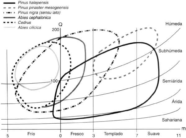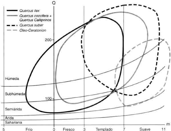 La clasificación que se utiliza más frecuentemente es la que elaboró Emberger en 1939, trazando un diagrama bidimensional en el que el valor de un «cociente pluviotérmico»1 de un lugar determinado constituye el eje de las ordenadas y la media del mes más frío del año el de las abscisas. La representación de un conjunto de estaciones de la zona biogeográfica mediterránea ha permitido delimitar varios conjuntos climáticos: clima árido, semiárido, subhúmedo y húmedo. El establecimiento en los diagramas de las coordenadas de estaciones externas en las que aparece una determinada planta mediterránea permite delimitar la zona bioclimática que ocupa (Figura 2).