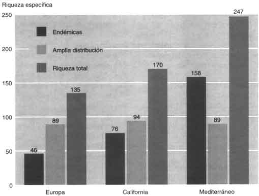 El balance de las leñosas de California se ha establecido de acuerdo con The Jepson manual: higher plants of California (Hickman, 1993), pese a ciertas dificultados relativas a la distinción entre árboles y arbustos, en especial en el género Arctostaphyllos. Existen 76 leñosas endémicas de la región mediterránea californiana, mientras que 94 taxones están más ampliamente repartidos. La comparación de los balances de las dos regiones mediterráneas del hemisferio norte muestra que las afinidades ecológicas, biogenéticas e históricas son grandes (Mooney y Dunn, 1970: Quézel y Taylor, 1984). En efecto, los grandes fondos vegetales resultan análogos, sobre todo en cuanto a las leñosas: de 58 géneros de California, 34 están igualmente presentes en torno al Mediterráneo. Además, las perturbaciones climáticas cuaternarias han hecho que desaparezcan del ámbito del Mediterráneo diversas especies todavía presentes en California: Sequoia, Sequoiadendron, Umbellularia, Tsuga, etc. (Roiron, 1992). A las diferencias de superficie entre estos dos conjuntos (2 300 000 km2 en Europa frente a 324 000 km2 en California) corresponde una discordancia entre los balances vegetales (respectivamente 25 000 y 4 400 especies según Quézel) (1985), pero éstos son muy comparables sise cotejan superficies análogas (Médail y Quézel, 1997), por ejemplo Marruecos mediterráneo (300 000 km2 y 4 200 especies) y California mediterránea (324 000 km2 y 4 400 especies). Sin embargo, la región circum-mediterránea presenta una riqueza en elementos arbóreos, incluidos los endémicos, mucho más elevada que los otros dos conjuntos (véase la figura). Sólo los géneros Dendromecon, Sequoia, Sequoia-dendron y Umbellularia son endémicos de California, contra 14 endémicos o subendémicos en la región circum-mediterránea: Argania, Argyrocytisus, Cedrus, Ceratonia, Chamaerops, Fontanesia, Gonocytisus, Hesperola-burnum, Petteria, Podocytisus, Púnica, Securinega, Tetraclinis y Warionia.