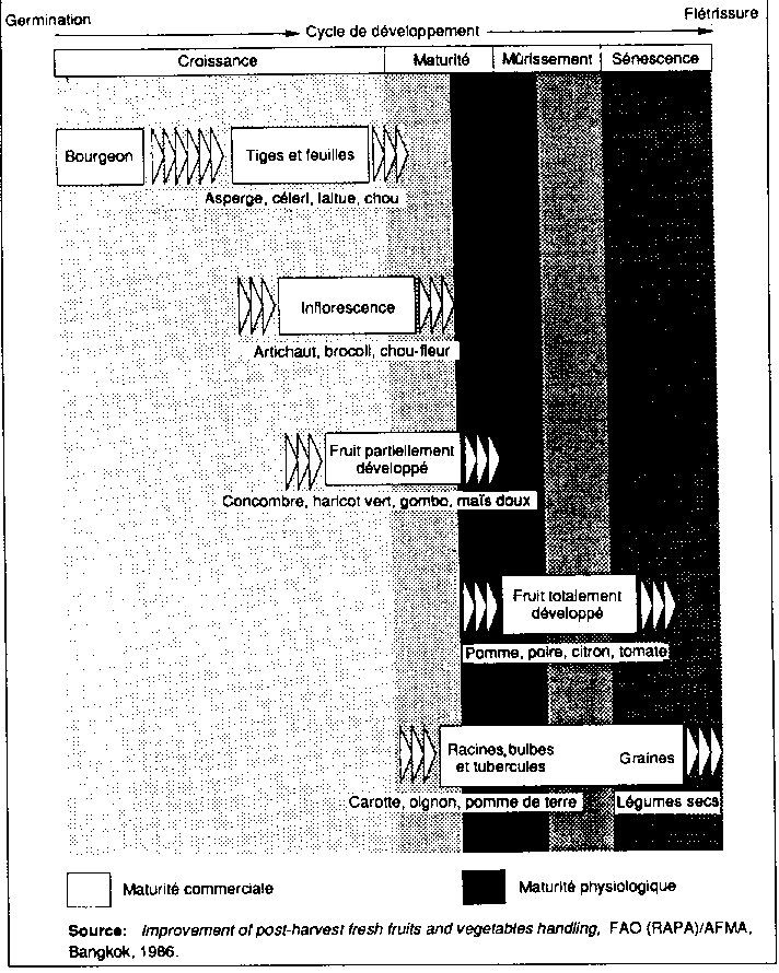 Figure 2 Comparaison de la maturité physiologique et de la maturité de récolte des produits frais. Pour les différentes denrées, la maturité de récolte peut intervenir à un stade très différent du développment de la plante par raport à b maturité physiologique.