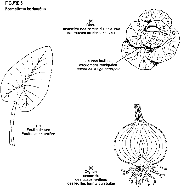 | Formations herbacées tout entières au-dessus du sol (avant la floraison) | Chou, laitue (figure 5a) |