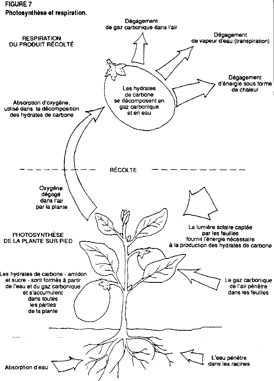 Nous avons indiqué plus haut que la détérioration physiologique était l'une des causes des pertes de produits frais après la récolte. On entend par physiologie l'étude des processus qui se produisent à l'intérieur des organismes vivants. Après la cueillette des produits frais, ces processus vitaux se poursuivent, mais sous une forme modifiée. La plante ne pouvant plus remplacer l'eau ni les éléments nutritifs, elle doit puiser sur ses réserves et, lorsque celles-ci sont épuisées, elle subit un processus de vieillissement rapidement suivi de décomposition. Même si le produit n'est pas endommagé ou attaqué par des organismes nocifs, il deviendra impropre à la consommation à cause de ce pourrissement naturel. Les principaux processus physiologiques normaux qui conduisent au vieillissement sont la respiration et la transpiration (figure 7).