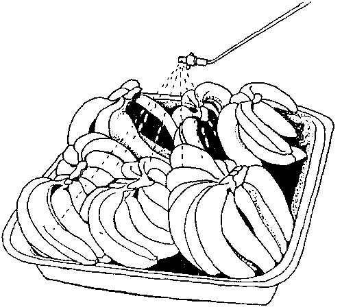 L'immersion est exécutée à la main, en utilisant une suspension d'antifongique agitée à la main (figure 16); des paniers en treillis permettront de tremper plusieurs fruits à la fois; après trempage, le produit sera égoutté et séché dans un lieu aéré, protégé du soleil.