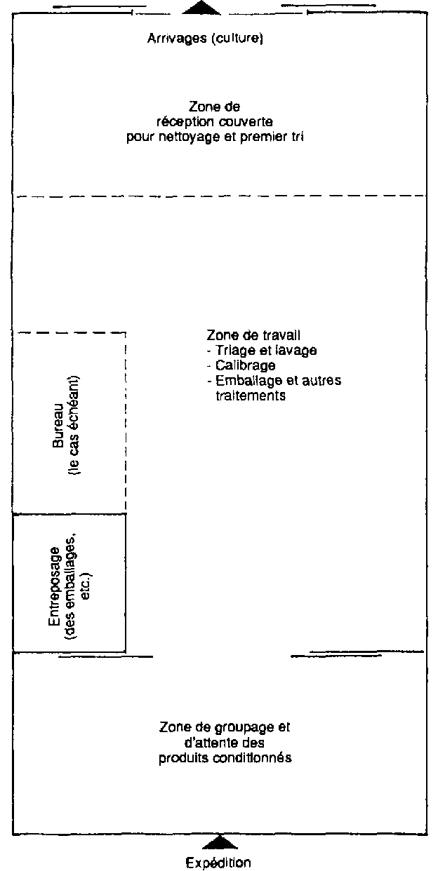 La conception de l'ensemble dépendra de l'espace disponible. D'une façon générale, un bâtiment à un seul niveau avec aire de réception d'un côté et aire d'expédition de l'autre sera la disposition la plus commode. Ce plan permet de séparer la zone de réception-nécessairement souillée-des activités d'emballage et d'expédition, ce qui diminue le risque de contamination des produits déjà triés et emballés. Cette disposition permet également d'éviter embouteillages et désordre en séparant véhicules à l'arrivée et véhicules au départ (figure 24). Si le site est trop exigu, on pourra envisager à la rigueur une disposition en forme de U avec zone de réception et d'expédition proches l'une de l'autre si possible. Mais elle n'est pas à conseiller, car il en résultera inévitablement des problèmes de contamination et d'encombrement, sans parler des agrandissements futurs qui seront difficiles à réaliser.