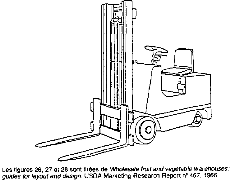 - Les chariots élévateurs à fourche motorisés (figure 28) sont utilisés dans les grands ateliers d'emballage pour déplacer les charges posées sur les palettes.