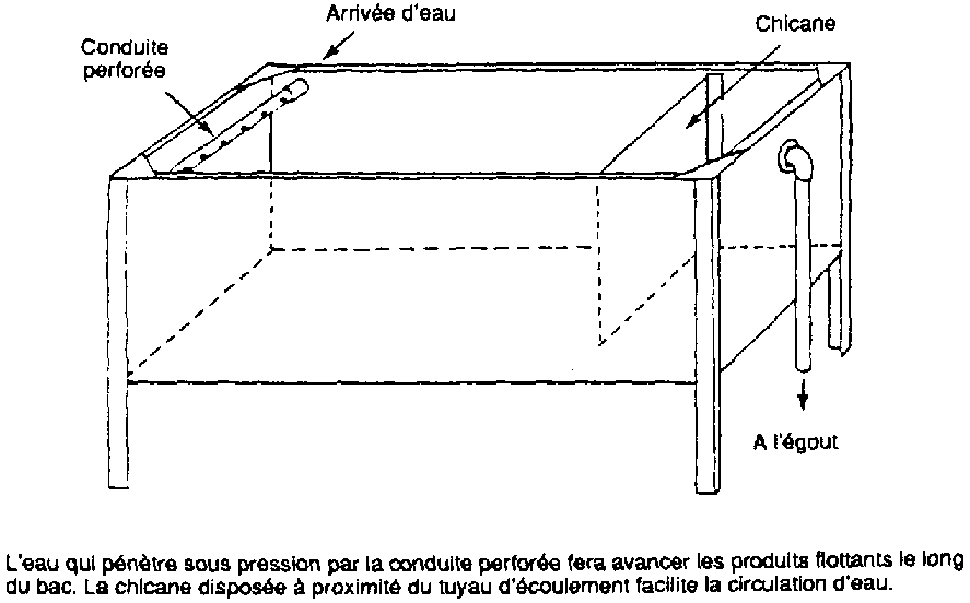 Lavage. Le lavage des produits pourra être effectué à l'eau courante fraîche, dans un bac galvanisé du type représenté à la figure 29. S'il s'agit de produits qui flottent, ils pourront être poussés par l'eau qui coule du tuyau d'amenée, perforé d'un côté, jusqu'à l'extrémité du bac. La chicane verticale ménagée près de l'écoulement permettra de s'assurer que tous les produits contenus dans le bac sont bien nettoyés.