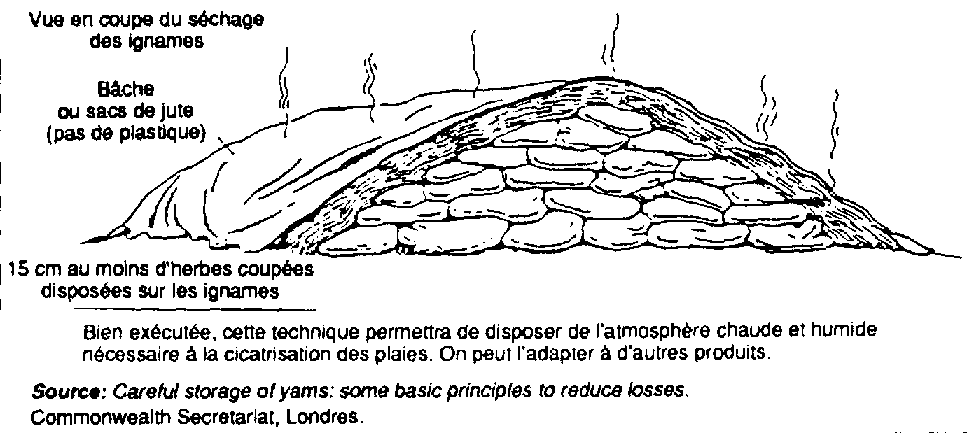 Toutes les racines et tous les tubercules étant plus ou moins endommagés en cours de récolte et de manutention, le séchage doit être assuré dans les meilleurs délais. Pour cela, on peut limiter la ventilation, ce qui permettra d'élever suffisamment la température pour favoriser le séchage. En même temps, l'air se chargera d'humidité compte tenu de la déperdition d'eau normale des racines et du taux d'évaporation élevé des lésions (figure 33).