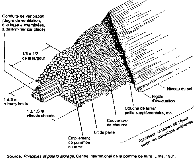 Les pommes de terre sont disposées sur un lit de paille de I à 3 m de large, la largeur ne devant pas excéder 1,5 m dans les climats chauds. Une conduite de ventilation est ménagée à la partie inférieure. Les pommes de terre empilées sont recouvertes d'environ 20 cm de paille compressée qui peut être ensuite couverte de terre, appliquée sans tasser sur une hauteur de 30 cm.