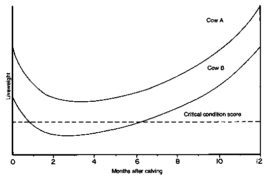 Negative energy balance itself is not likely to have much effect on the length of the postpartum period as long as the cow is in good condition at calving (Cow A) and its condition remains above the critical condition score, which is defined as that score below which cows still in negative energy balance (Cow B) are likely to suffer from extended anoestrous periods and silent heats.Source: Haresign (1984).